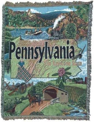 Colorful tapestry throw featuring landmarks, icons and more from Pennsylvania! Includes the country-side, horse and carriage, trains and a ware battlefield.