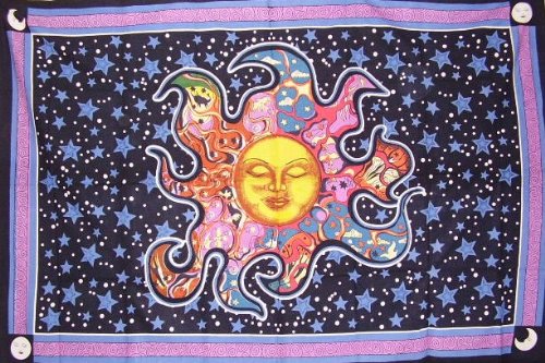 PSYCHEDELIC CELESTIAL TAPESTRY ~ This one will take you back to days of the Yellow Submarine for sure. Made of 100% power-loomed cotton, offering a nice smooth, tight weave. Measuring approximately 7.5 feet x 5 feet. They are colorfast and can be machine washed on cool/gentle separately and tumble dried. A light to mid weight material with endless versatility. Use your celestial tapestry for: ~FURNITURE COVER~BEDSPREAD~ ~TABLECLOTH~BEACH BLANKET~ ~ROOM DIVIDER~A GREAT AFFORDABLE GIFT~ ~HANG THEM ON YOUR WALL OR CEILING~! It will delight and enchant you~:-)