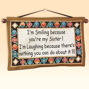 Sister tapestry spreads sisterly "love" while accenting the beauty of your home. The colorful designs and humorous message are woven on a Jacquard loom and look great as a wall hanging or draped over furniture. Cotton polyblend, 13x 9'.