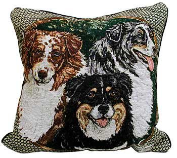 Featuring beautiful artwork by artist Pat Lehmkuhl, this plump 18" x 18" throw pillow is made from a cotton polyester blend and depicts the three faces of a red merle, blue merle and tricolored Australian Shepherd. Made in the USA. Please spot or dry clean only.