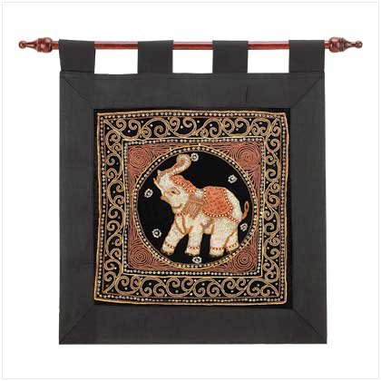 Created in the style of Indian artisans, an intricate beaded elephant motif is stunning against a lush black background. This fabric wall hanging graces any room with an exotic Far East flair! Weight 0.6 lb. Fabric with beads and sequins. Wood hanging rod included. Dry clean only. 18.75 x 21 inches tall.