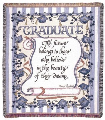 "GRADUATE... The future belongs to those who believe in the beauty of their dreams. Eleanor Roosevelt" With a inspiring quote by Eleanor Roosevelt, artist Lynn N. Parker has created a colorful tapestry throw for the new graduates in your life. Complete with a border of ivy and mortarboards.