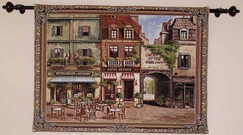 This tapestry portrays quaint European village charm with its narrow streets, old buildings with shuttered windows, and flowers spilling from window boxes. Tables on a sidewalk cafe make the perfect setting for romance! Lined and ready to hang, this wall tapestry measures 42 x 31. Woven of 100% cotton.