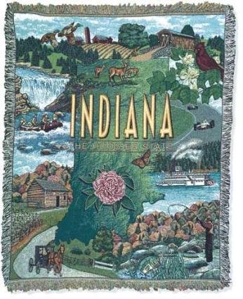 Colorful tapestry throw featuring landmarks, icons and more from Indiana! Includes a river, steamboat, fishers, birds, deer, horse and carriage, and a farm.
