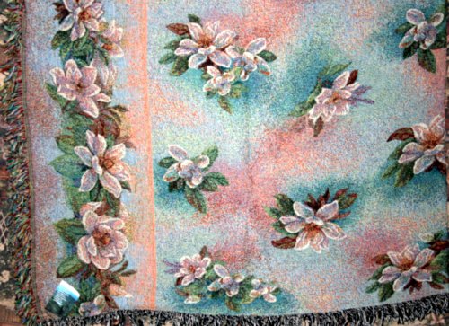 This is a Queen size or spread throw for day bed or couch. By Lena Liu "Magnolia" design.Fiber COntent 84% cotton 16% acrylic Machine Wash Cold Water Gentle cycle tumble dry.