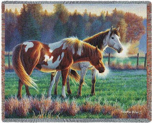 Two horses graze in a green meadow. Beautiful fall trees are seen in the background. The crisp morning air can be felt on the breath of these two gorgeous pasture buddies. Made in the USA! This gorgeous afghan is jacquard woven by master craftsmen and they approach each woven piece with an eye for detail that only comes from years of experience. This is a high quality item that will last for years to come. 100% Cotton. Usually ships in 1-2 business days. Search words- horse horses SHIP CODE- WH