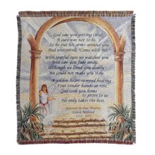 Youll be cozy warm with thoughts of your departed friend or family member when you wrap yourself in our gorgeous memorial throw. Jacquard woven of soft 100% cotton, our tapestry throw features a beckoning angel beneath a gold archway. We embroider any message on 3 lines, up to 25 characters per line. Fringed throw measures a generous 50"L x 60W. Machine washable.